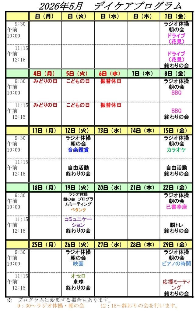 2026.04.28銀杏庵 デイケア プログラム 5月 今年は桜が咲くのが例年より早く、GWには散ってしまいそうな勢いですね。 少しずつ暖かい日も増え、生活リズムを整えるのにデイケアに立ち寄ってみてはいかがでしょうか? 5月のプログラムです。ぜひお越しください。 Post Share Hatena LINE RSS feedly Pin it note 銀杏庵 ゴールデンウイーク 外来休診のお知らせ 関連記事一覧 デイケア プログラム 4月 デイケア プログラム 5月 デイケア 2月プログラム デイケア 8月のプログラム予定 デイケア 12月 プログラム デイケア プログラム 7月