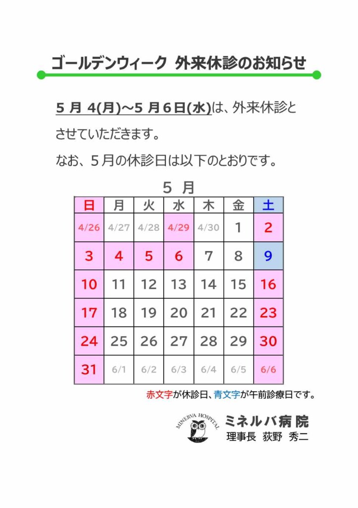 2026.04.13ミネルバ病院 ゴールデンウイーク 外来休診のお知らせ Post Share Hatena LINE RSS feedly Pin it note ミネルバ病院 臨時休診のお知らせ 関連記事一覧 オンラインカウンセリングについて 【重要】新型コロナウイルス感染者の発生 【お知らせ】外来カウンセリング体制変更 【重要】新型コロナウイルス感染症について R4.8.13 【重要】新型コロナウイルス感染者の発生 第2報 R4.8.1 【重要】新型コロナウイルス感染者の発生(第6報)R4.6.5